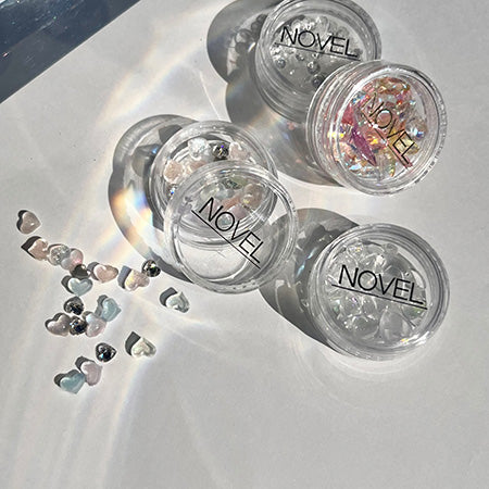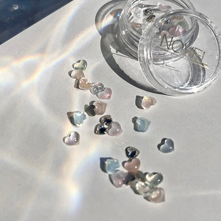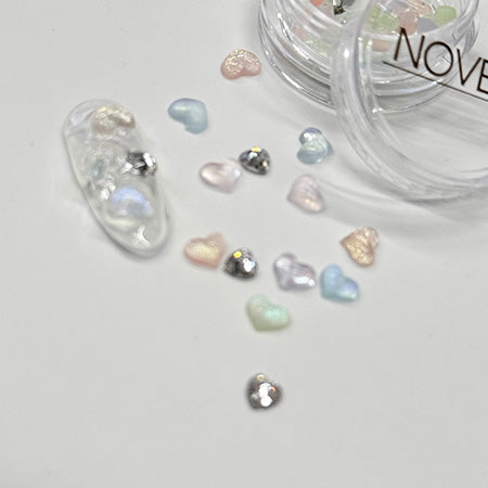 This item is a mix of plump heart-shaped clear parts and rhinestones. The clear parts come in a variety of colors, so please use them according to your design. Clear heart parts are about 5mm, heart rhinestones are about 4mm.