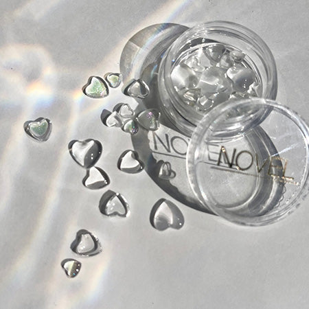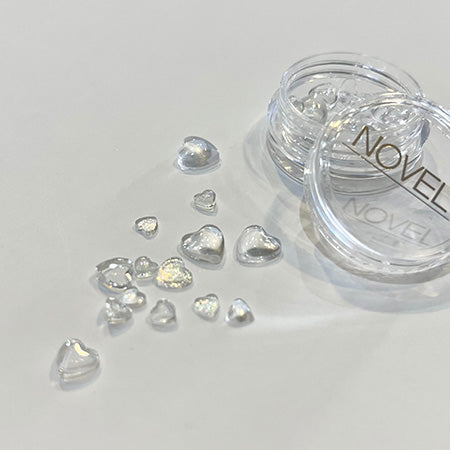 The plump heart-shaped parts are a mix of sizes of about 3.5mm, 5mm, and 7mm. They are a mix of clear and aurora glitter.