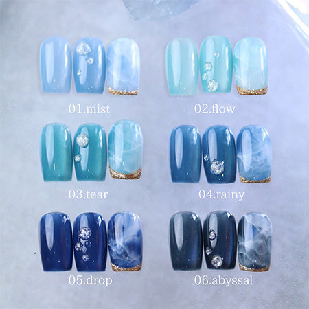 A sheer blue color base that doesn't show through your natural nails too much, with microparticle mag that gives a sense of depth